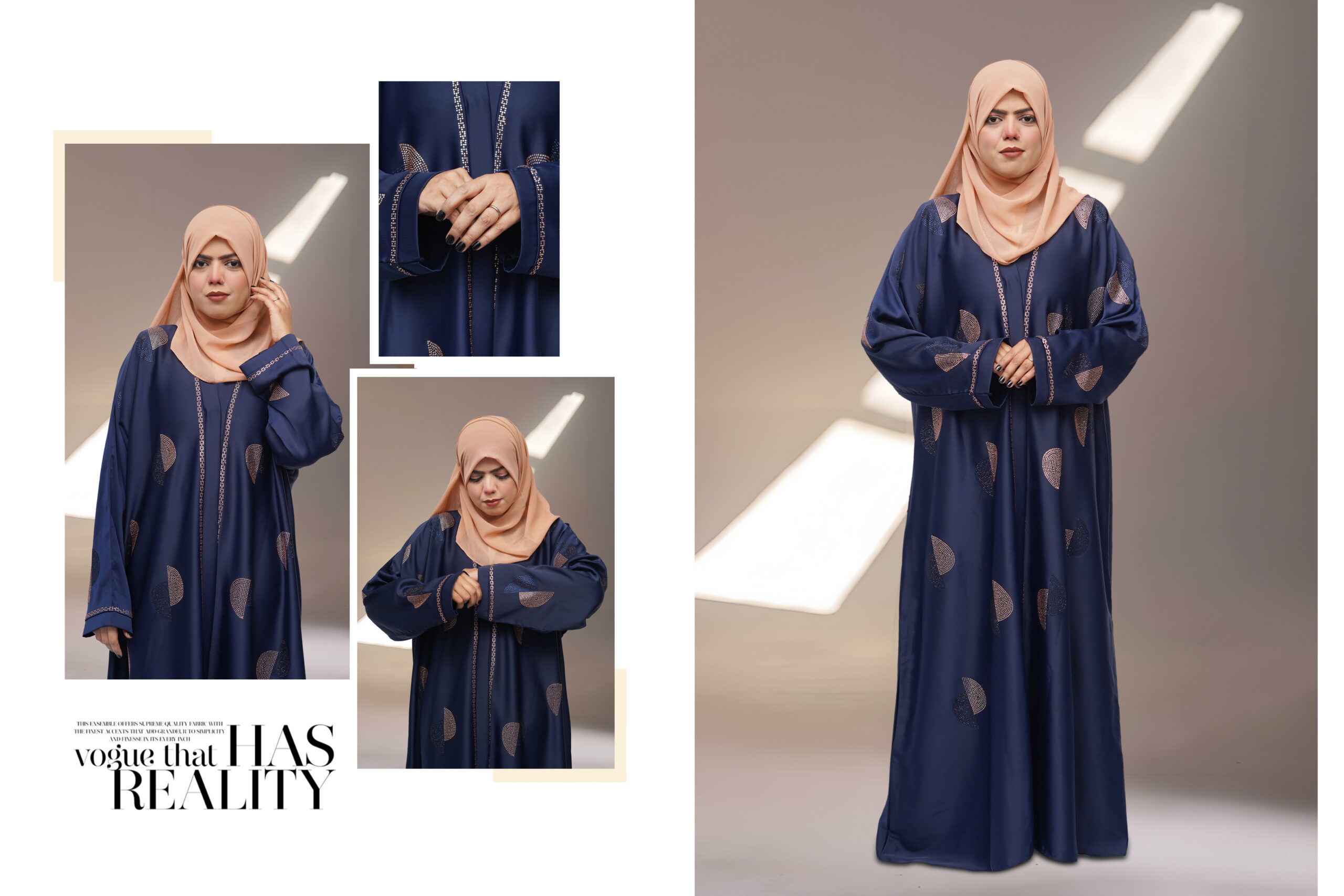 This Open Style TikTok Fabric Abaya features elegant double colour DMC stone work, giving it a classy and fancy appearance. The soft TikTok fabric ensures comfort, while the stone detailing makes it perfect for formal gatherings and special occasions. Comes with a plain chiffon dupatta for a complete modest look.
